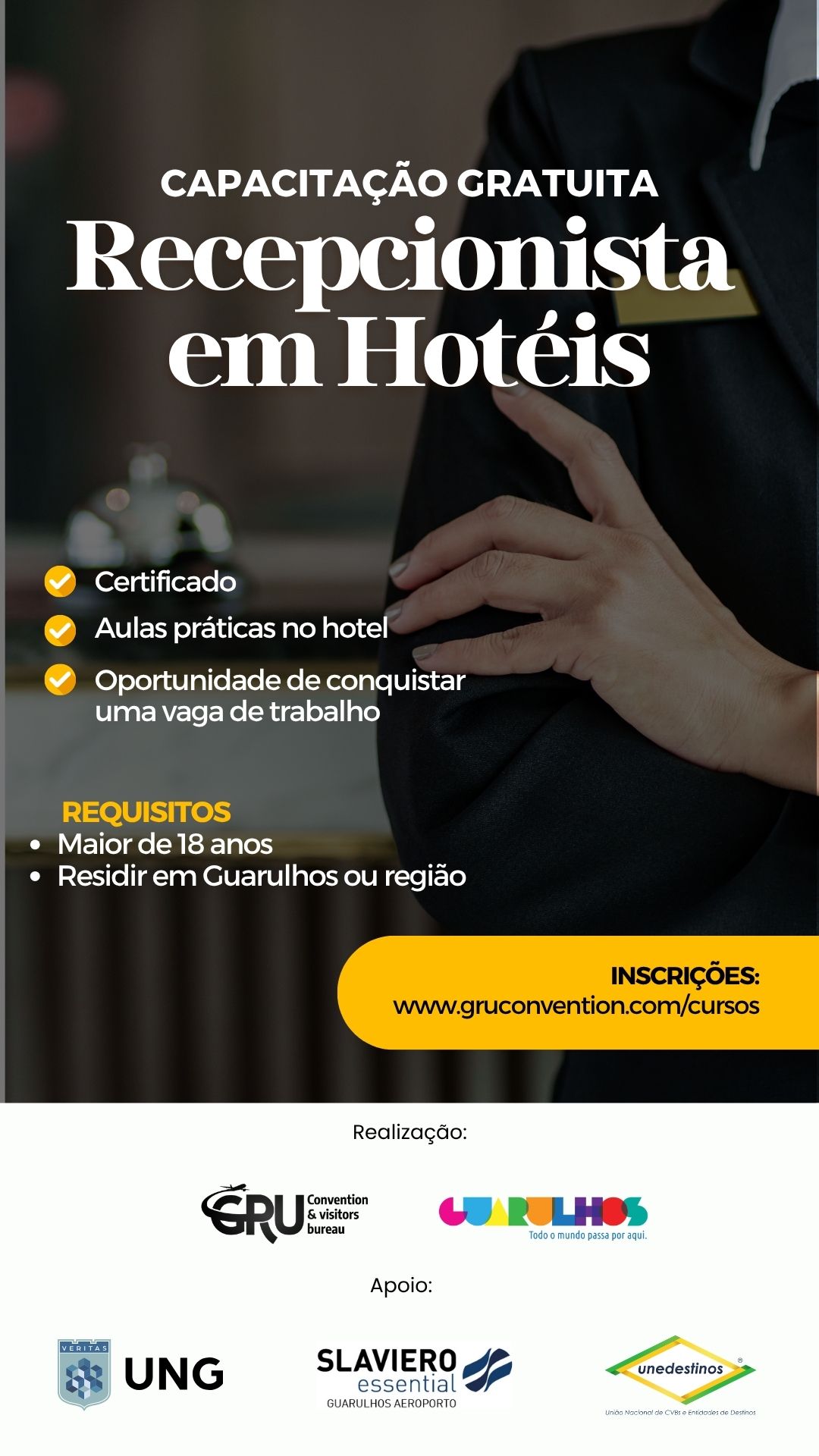 O Curso é presencial, totalmente gratuito, e tem duração de 40 horas. Além das aulas teóricas em sala de aula os alunos terão a oportunidade de vivenciar a prática de recepção numa experiência no Hotel Slaviero Guarulhos. As inscrições serão feitas através do site: www.gruconvention/cursos