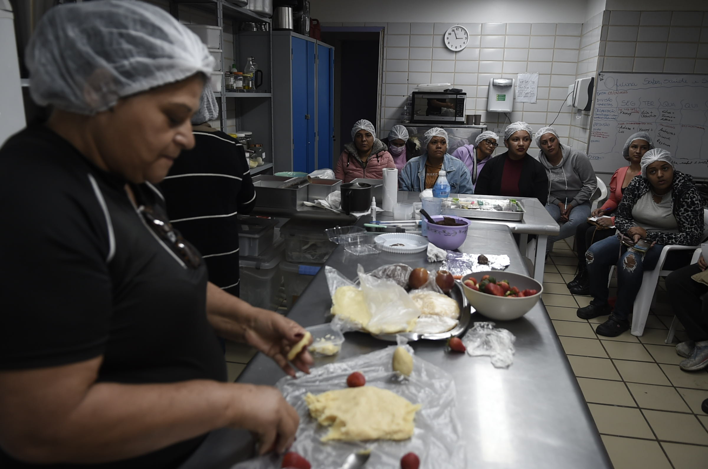 Aos 61 anos, Zilma Dias de Oliveira da Silva, atuava como confeiteira até adquirir baixa visão por causa de diabetes e glaucoma. Ela frequenta as aulas do projeto Práticas Educativas para Inclusão Social (Peis) há seis anos. “A oficina é muito instrutiva. Estou gostando e me divertindo”, afirmou a moradora da Vila Rio de Janeiro, que auxiliou a confeiteira Rosemeire durante a aula.