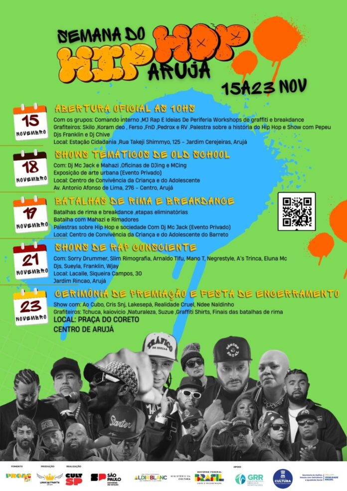 A programação começará no dia 15 de novembro, na Estação Cidadania, localizada na rua Takeji Shimmyo, 125, Jardim Cerejeiras, a partir das 10h, com a Feira do Microempreendedor em Movimento. A atividade, que também dá início à Semana do Hip Hop em Arujá, contará com shows ao vivo de artistas locais, grupo de samba, workshops de graffiti e break dance, além de uma palestra ministrada por “Pepeu” – rimador pioneiro do rap brasileiro.