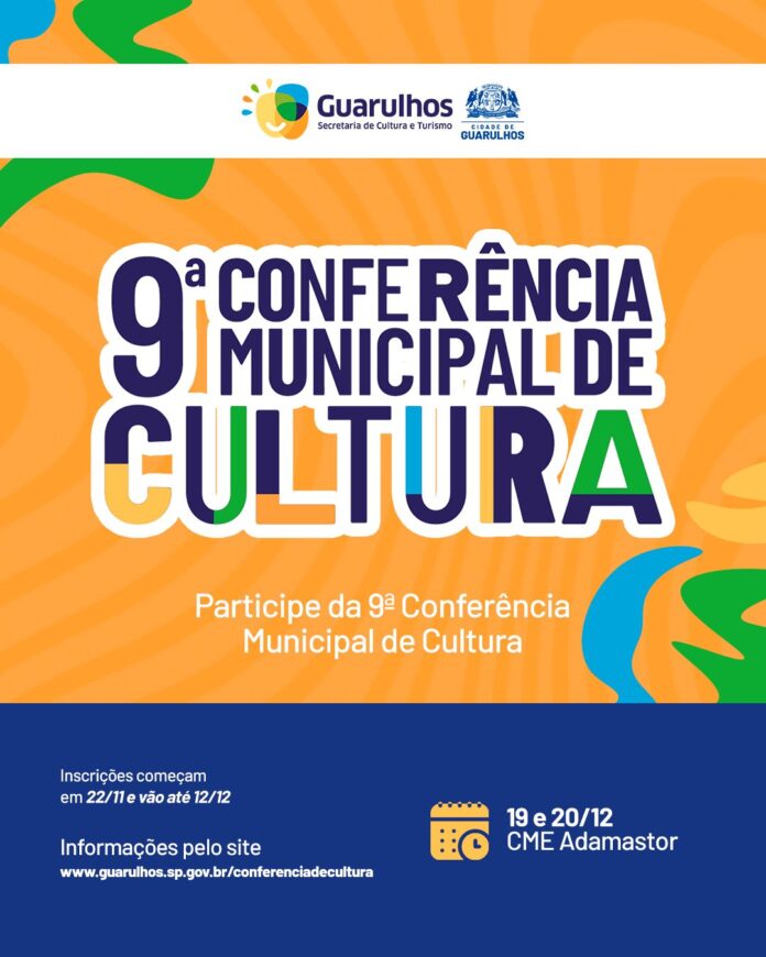 Com o tema “Democracia e Direito à Cultura”, Guarulhos realiza nos próximos dias 19 e 20 de dezembro a 9ª Conferência Municipal de Cultura. O evento, que acontecerá no CME Adamastor, é aberto ao público e os interessados em participar já podem realizar inscrição no portal https://www.confculturaguarulhos.com.br até 12 de dezembro.