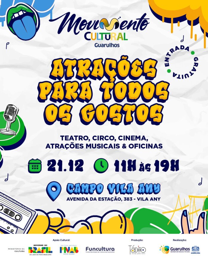A Prefeitura de Guarulhos, por meio da Secretaria de Cultura e Turismo, realiza neste domingo (21) mais uma edição do Movimento Cultural Guarulhos, iniciativa que promove a ocupação artística do espaço público e amplia o acesso da população a diferentes linguagens culturais. O evento acontece no Campo Vila Any, localizado na avenida da Estação, 383, com entrada gratuita.