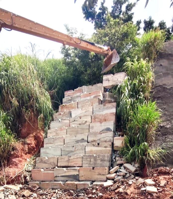 O paredão é formado por malotões de concreto – peça pré-moldada, pesada e resistente, que evitará a erosão do talude existente, bem como promoverá o direcionamento das águas das chuvas, evitando alagamentos nas ruas que ficam na parte mais baixa do bairro.
