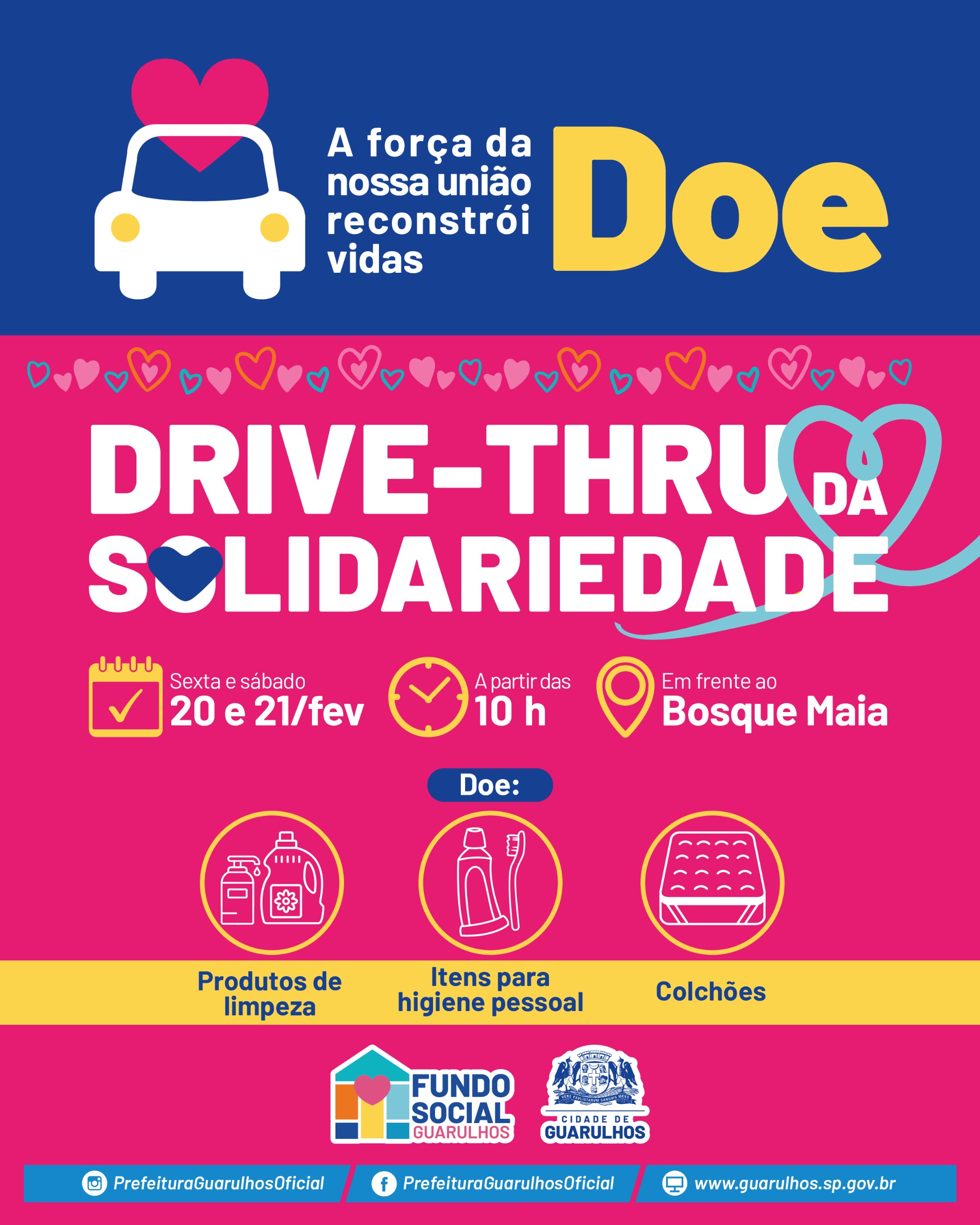 O Fundo Social de Solidariedade e a Prefeitura de Guarulhos irão realizar nesta sexta-feira (20), em frente ao Bosque Maia, a nova edição do Drive-Thru da Solidariedade, campanha para arrecadar doações às vítimas das chuvas que atingiram o município no início deste ano.